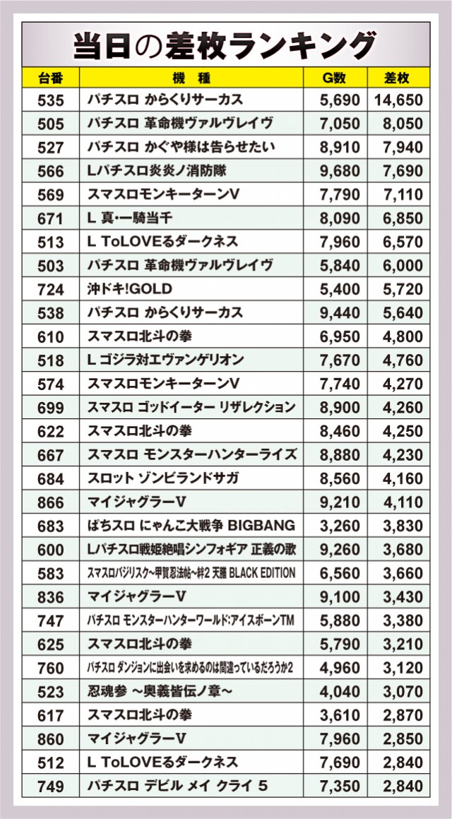 トップ差枚数は万枚オーバー! 『パチスロ からくりサーカス』の535番台から14,650枚が飛び出た。実はこの535番台を筆頭にトップ4まではSANKYO勢がひしめく結果となっている。