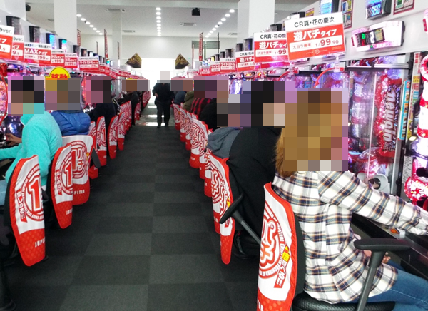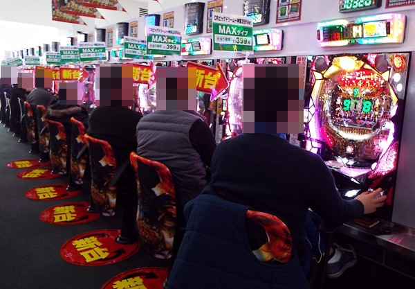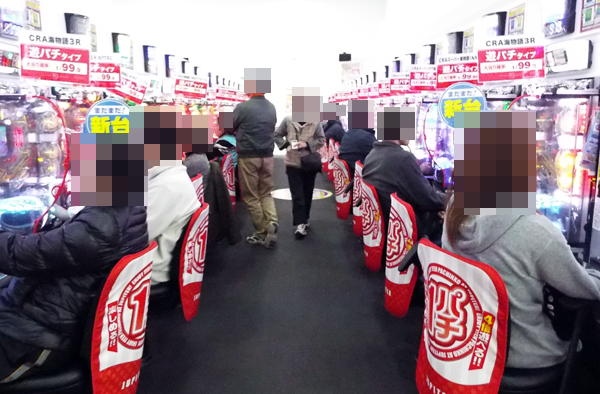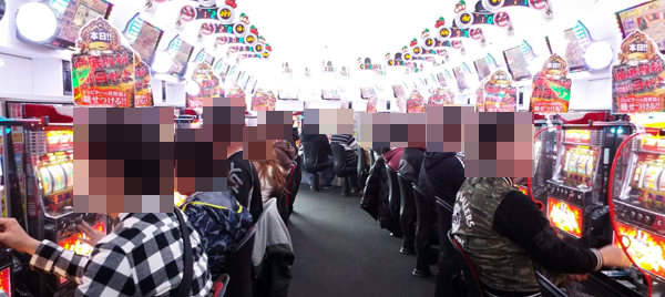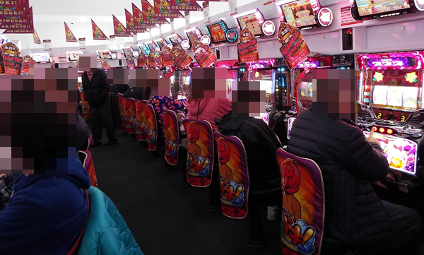 取材日は開店前からパチンコ・パチスロコーナーそれぞれの入り口に、入場を待つプレイヤーによって列ができるほど、にぎやかな状況となっていた。