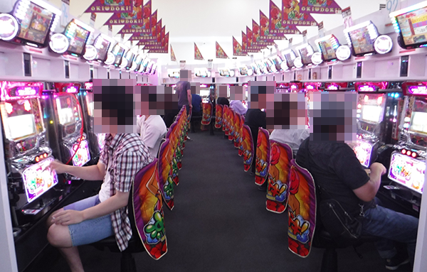 15時頃のパチスロにおいて、注目を受けていたのが「沖ドキ!-30」と「バジリスク~甲賀忍法帖~絆」。プレイヤーたちの明るい笑顔からは、充実した時間を過ごせていることもうかがえた。