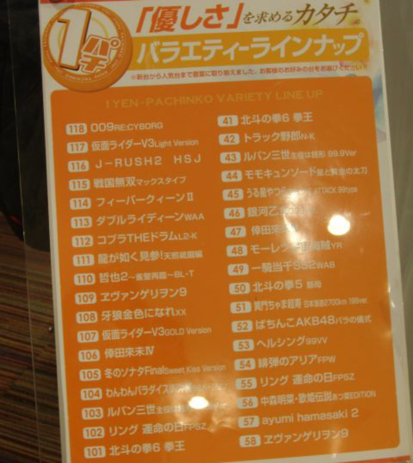 貸し玉料金はパチンコが4円と1円、パチスロが20円と5円の2種類ずつあり、4円パチンコでは海物語シリーズや「CR牙狼 金色になれ」など定番機種や人気機種が好評。