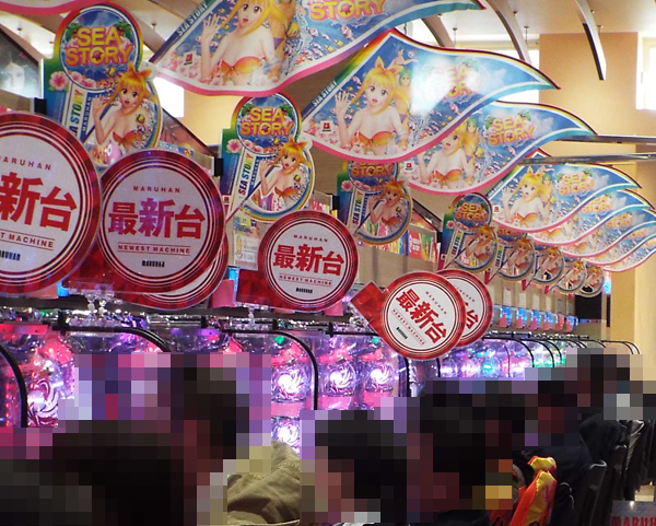 14時を過ぎるころには華やかな展開をみせる姿も多く、4円パチンコでは新台の「CRスーパー海物語IN JAPAN」を筆頭に海物語シリーズが大盛況。