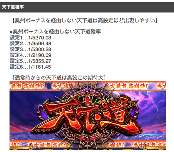 奥州ボーナスを経由しない天下道の確率は、奇数と偶数設定によって大きな設定差が存在。
