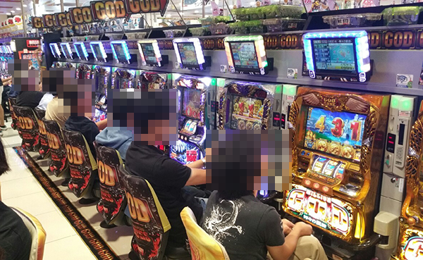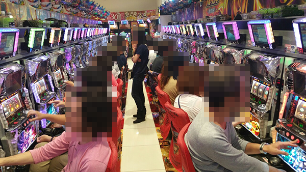 ジャグラーシリーズをはじめとするボーナスタイプのシマも盛況。シマのなかには、シンプルな告知をじっくりと楽しんでいるようなプレイヤーも見ることができた。