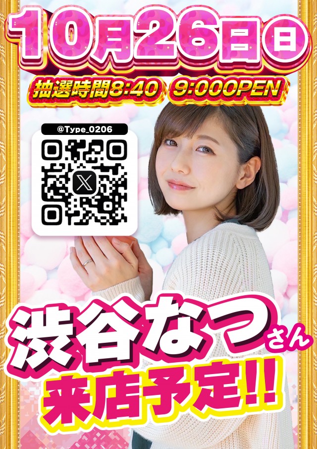 本日激スロ&渋谷なつさん来店&女神ガール来店❗抽選8:40~
