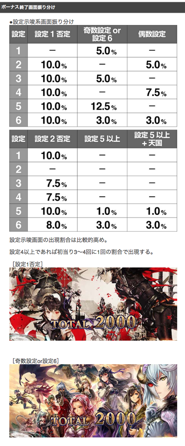 ボーナスの終了画面には設定示唆があり、設定1否定や設定5以上濃厚など、さまざまなパターンが存在する。