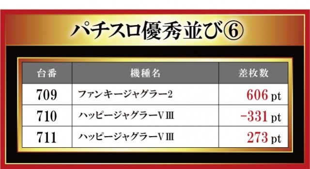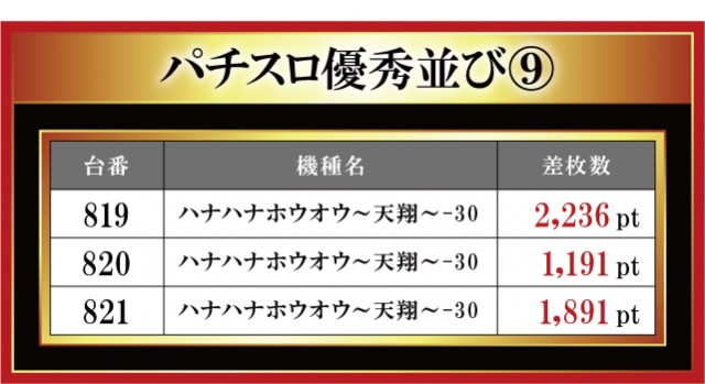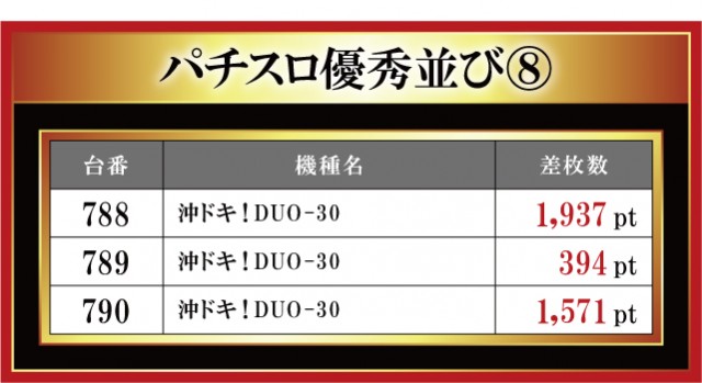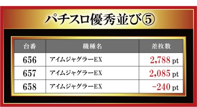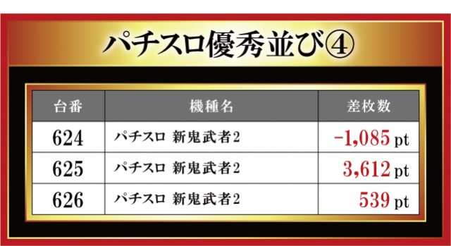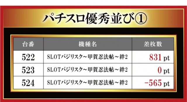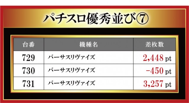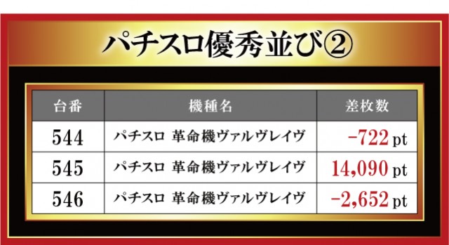 恒例となった月イチ実施の「はねバト!」。12月1日に実施された「四日市中央店」におけるパチスロ3台並びの優秀台をお伝えしていこう。まずは世間的に大注目を浴びているスマスロが早くも3台並びに! その3台並びの内、なんと『パチスロ 革命機ヴァルヴレイヴ』の545番台から万枚ptオーバー!! まさに新時代を飾るに相応しい結果が飛び出てきた。その他にも沖スロ・6.5号機・ノーマルタイプなど力を入れなければならない機種にしっかりと3台並びがある納得の結果となった。
