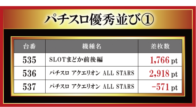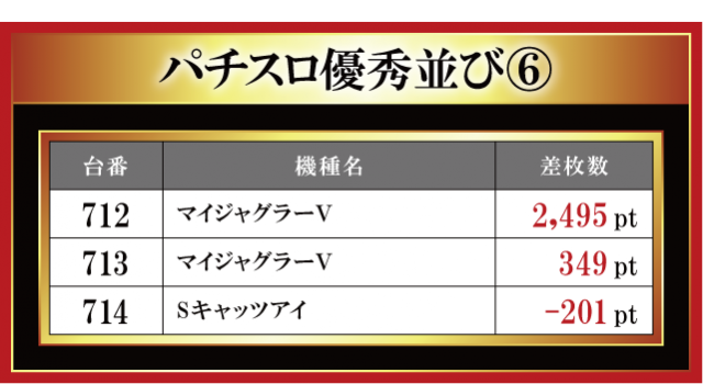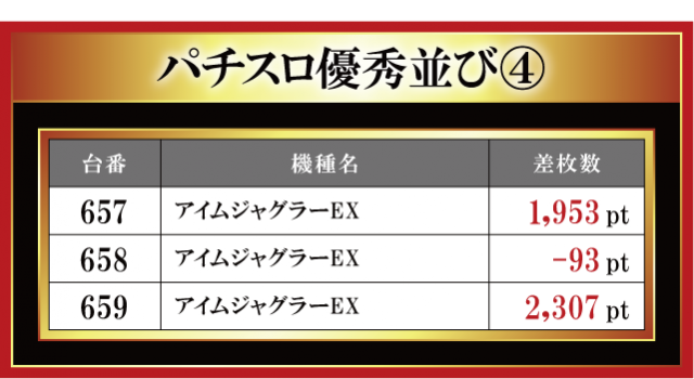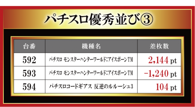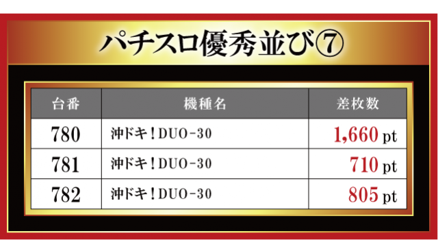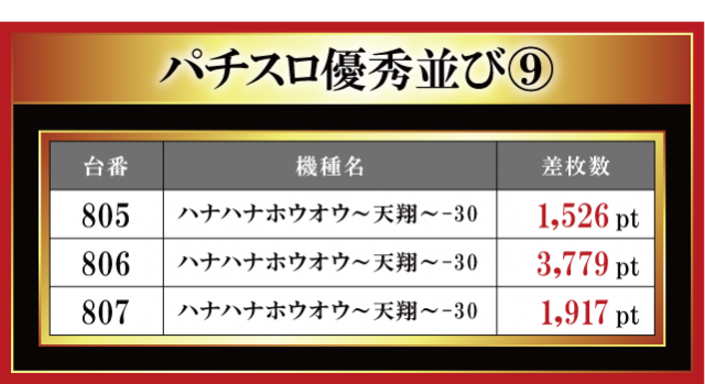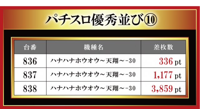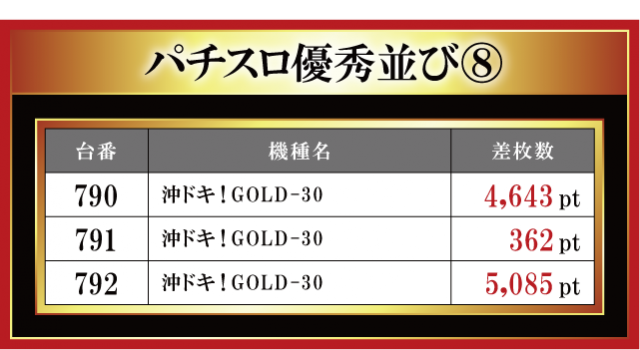 恒例となった月イチ実施の「はねバト!」。3月1日の「四日市中央店」の優秀台をお伝えしていこう。先月も優秀台として数多くピックアップされていたが、今月も沖スロの優秀台が目立っている。『沖ドキ!GOLD-30』の790番台から4,643枚、792番台から5,085枚。『ハナハナホウオウ~天翔~-30』の806番台から3,779枚、838番台から3,859枚となっており、差枚数的に高設定と言っても過言ではない。で、あるならば791番台の差枚数がたいしたことなかったので、3台並びならこういう台を狙っていくといいかも!?