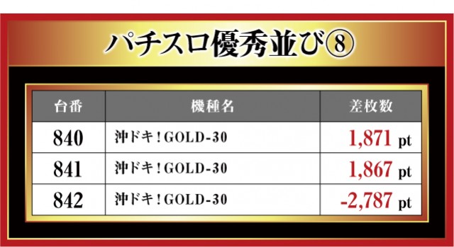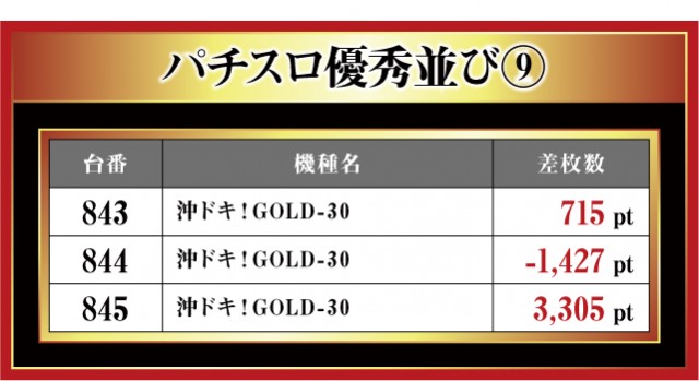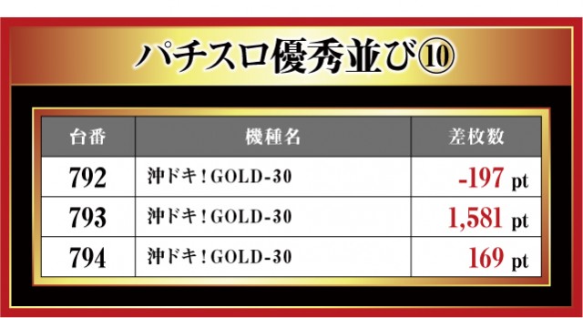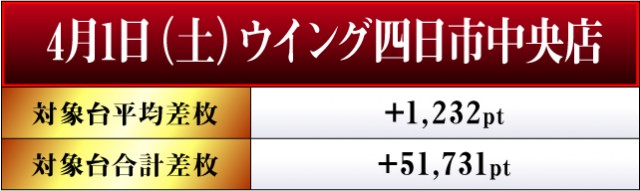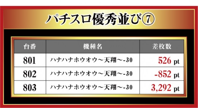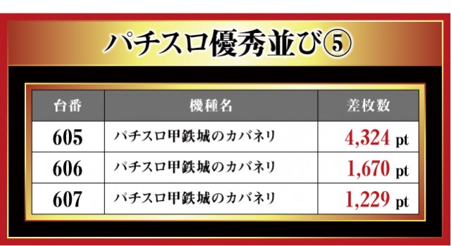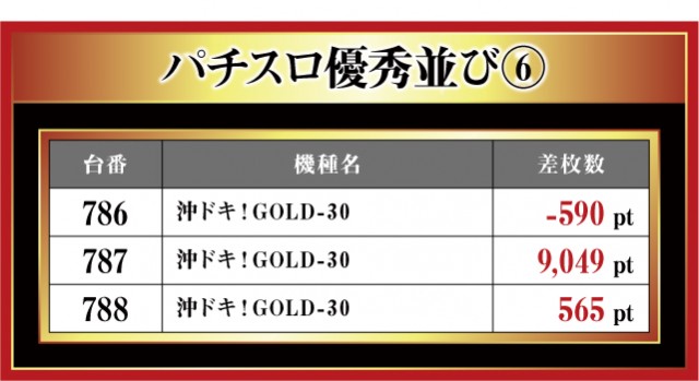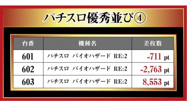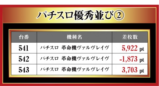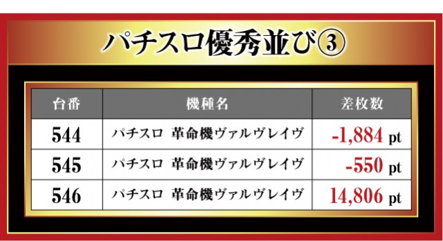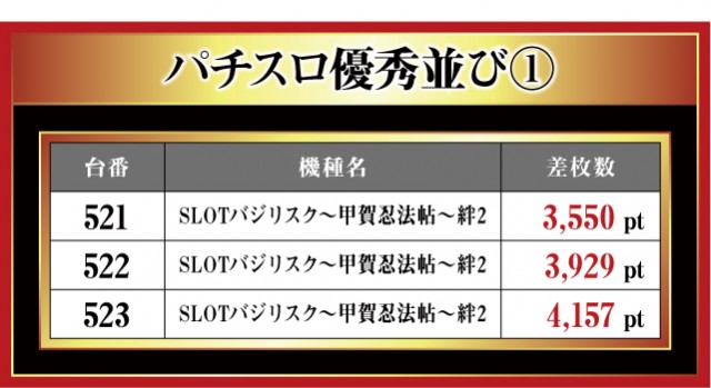恒例となった月イチ実施の「はねバト!」。4月1日の「四日市中央店」の優秀台をお伝えしていこう。ようやくいわくつきの3台並びが出現したか!? 『SLOTバジリスク~甲賀忍法帖~絆2』の521~523番台がキッチリ差枚が出ているのが分かる。また、3台並んでプラスとはならなかったものの、スマスロ『パチスロ 革命機ヴァルヴレイヴ』の541番台、543番台、546番台が優秀。6.5号機にも快勝レベルの差枚が出ている台があるなど、かなり気合いが入った今回の「はねバト!」となった。ちなみに今月のパチスロ部門では四日市中央店が差枚トップとなっている。