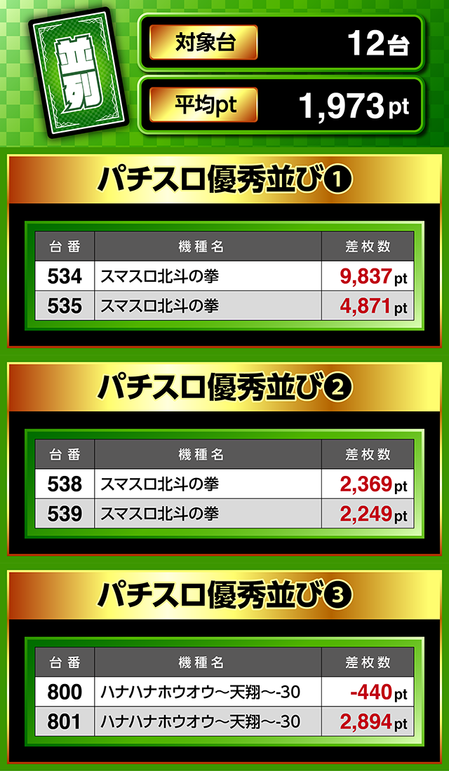 「スマスロ北斗の拳」の534番台と535番台が並んで、9,837ptと4,871ptを記録。
