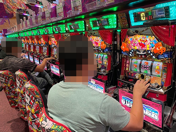 「マイジャグラーⅤ」や「アイムジャグラーEX」などで機種性能を上手く発揮するプレイヤーを確認。周囲から注目を集めていた。