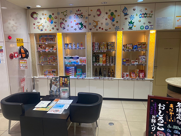 景品コーナーには日用品・お菓子・酒類など多彩なアイテムが揃っており、プレイヤーたちの目を引いていた。