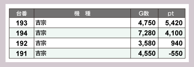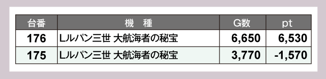 1万pt達成台があらわれた『いざ!番長』は、240番台も+3,600ptと見事なptを叩きだした。さらに『Lルパン三世 大航海者の秘宝』と『吉宗』からも、それぞれ6,000pt・5,000ptオーバーの優秀台が飛びだしている。