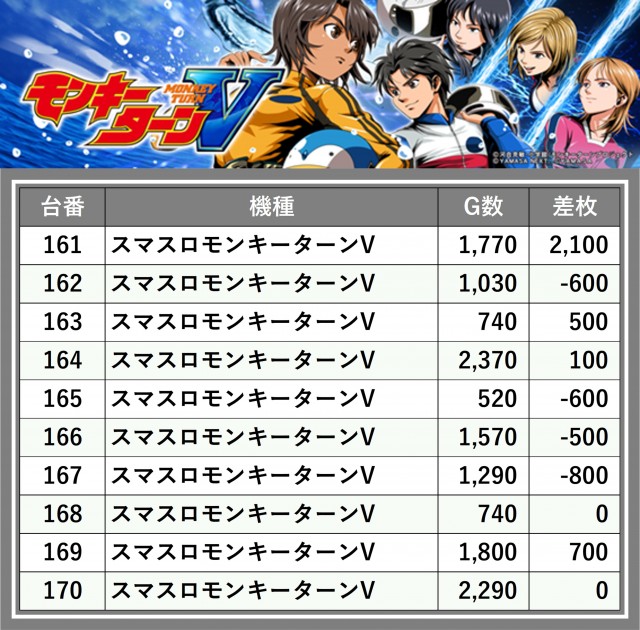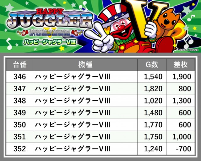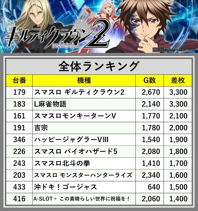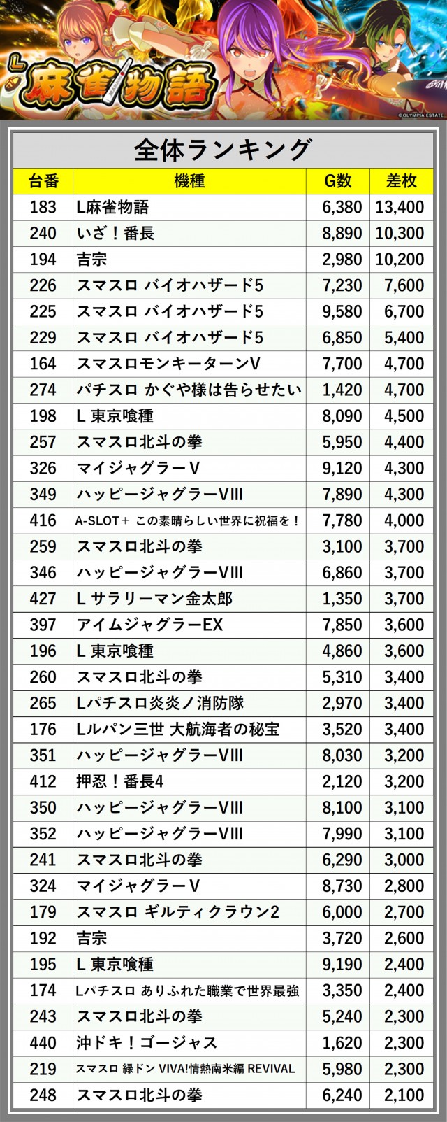 厳選された取材対象機種をはじめ、その他スロット全体から好記録が飛び出した!プレイヤーが楽しんだ1日を下記データにて振り返ってみて欲しい。