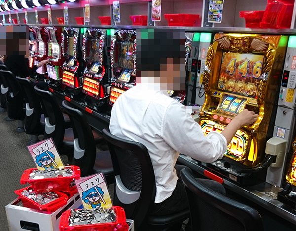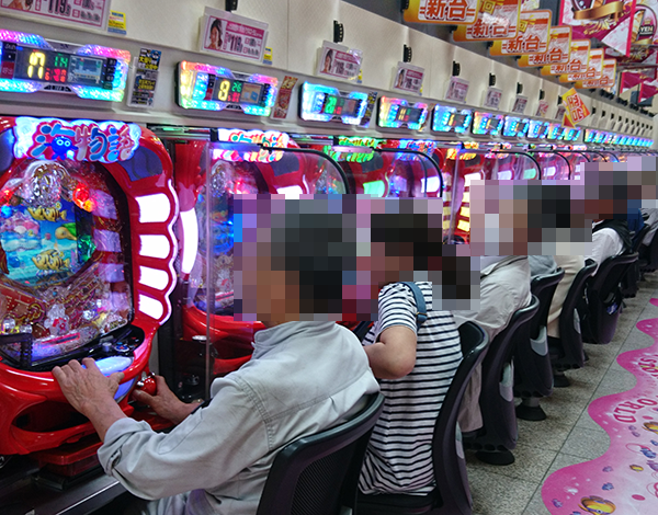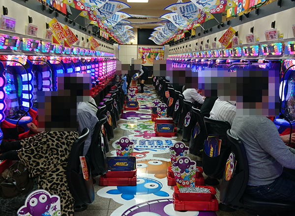 前日も注目を受けていた海物語シリーズをはじめ、いくつもの機種に華やかな光景が広がっていた。