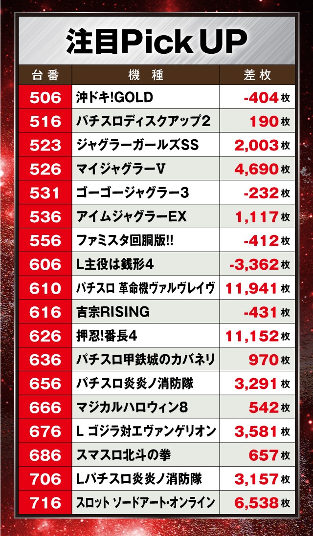 今回注目したのが「末尾6」。15台が対象となっており、1台平均2,000枚オーバーと大盛況だった!