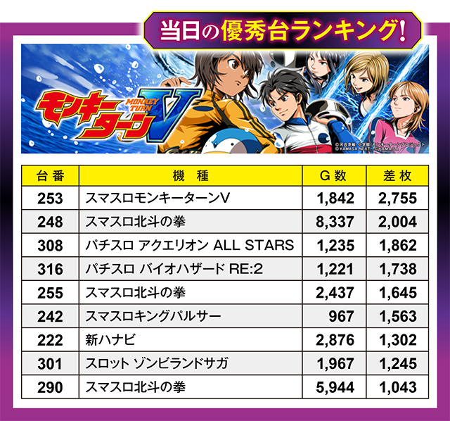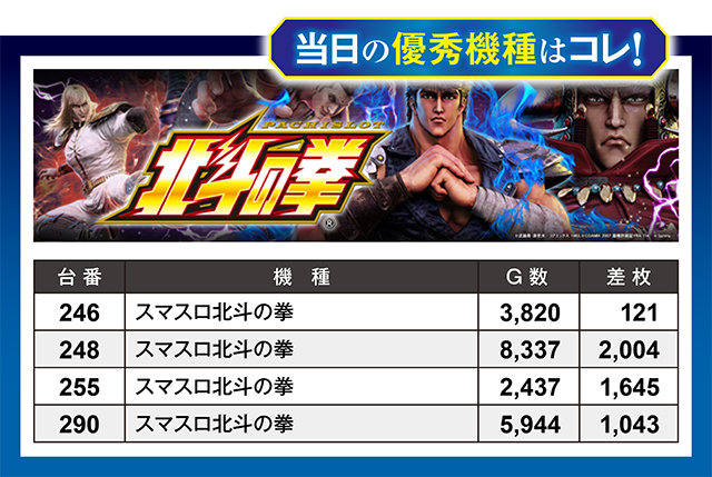 全台プラスを達成してのけた『スマスロ北斗の拳』だが、4台中3台は総ゲーム数がやや少なめ。その3台が8,000Gほど回されていたら、ランキング上位に鎮座していた可能性アリ!