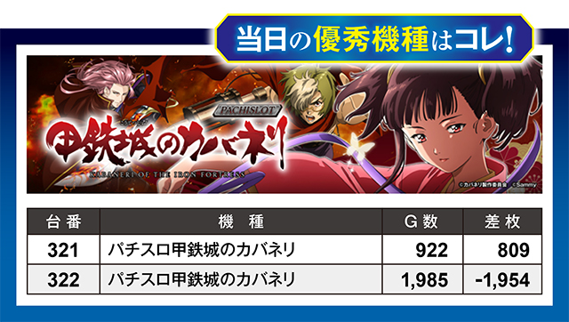 『パチスロ甲鉄城のカバネリ』も低稼働が結果に影響した機種。この程度の総ゲーム数では、良し悪しの見極めは難しく、なんともコメントしづらい結果となっている。