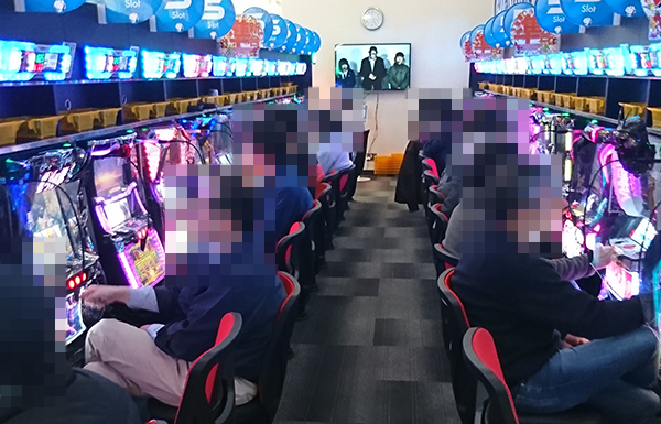 15時頃の20円パチスロでは、「バジリスク~甲賀忍法帖~絆」や「ミリオンゴッド-神々の凱旋-」などが盛況。あちこちに機種の醍醐味を堪能しているような姿があり、華やかなムードが感じられた。