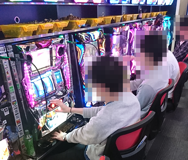 15時に近づいてきた頃の20円パチスロでは、朝イチとおなじく「バジリスク~甲賀忍法帖~絆」や「押忍!番長3」が活気づいていた。