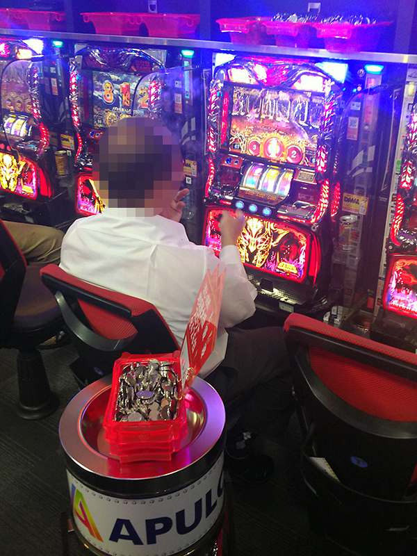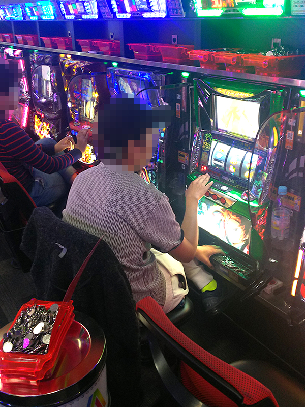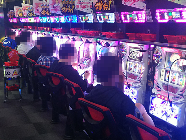 5円パチスロも20円同様、多彩なラインナップ。プレイヤーは思い思いの機種を選び、真剣な表情で台と向き合っていた。