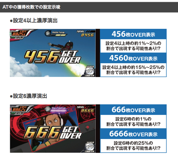 また、ボーナス中の登場キャラやAT中の獲得枚数表示には、高設定が濃厚となるパターンも存在する。