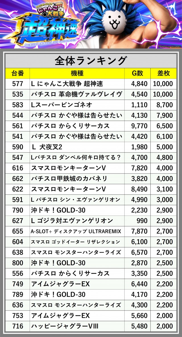 厳選された取材対象機種をはじめ、その他スロット全体から好記録が飛び出した!プレイヤーが楽しんだ1日を下記データにて振り返ってみて欲しい。