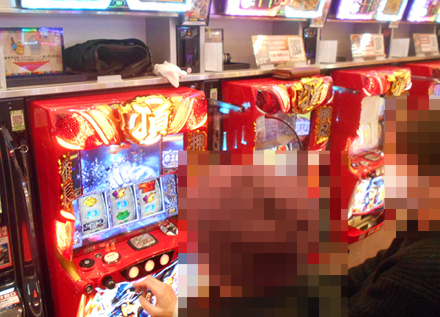 にぎやかなパチスロコーナーをまわっていると、「HEY!エリートサラリーマン鏡」でうれしそうに遊技をおこなっているプレイヤーを目撃!