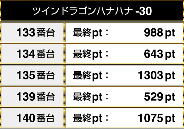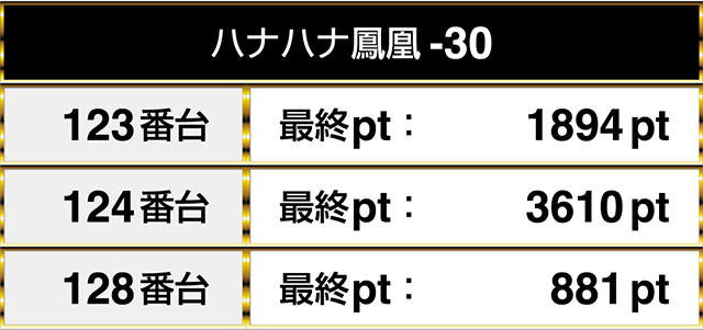『ハナハナ鳳凰-30』は3台がプラスptとなり、そのうちの1台は3000ptを上回った。