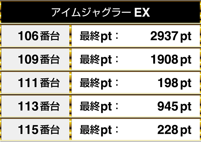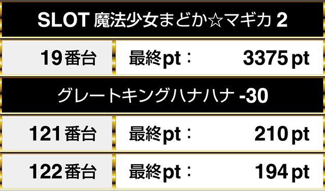 全台がプラスptとなり、2台は2000ptを上回ってこの日を終えていた。