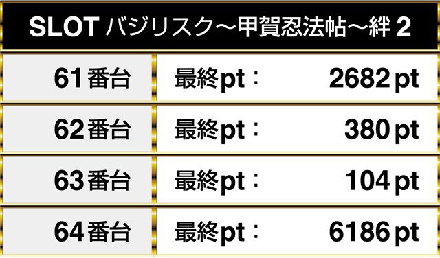 『SLOTバジリスク~甲賀忍法帖~絆2』は4台すべてがプラスptとなった。
