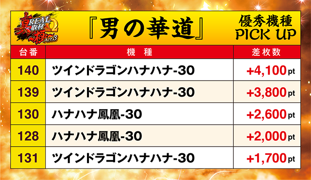 「ハナハナ鳳凰-30」には+2,000pt以上の台が複数あり、「ツインドラゴンハナハナ-30」では3台が+1,500ptを上回った。