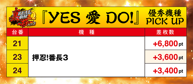 「押忍!番長3」は+6,000ptを上回る台があり、5台設置のうち8割となる4台がプラスpt!