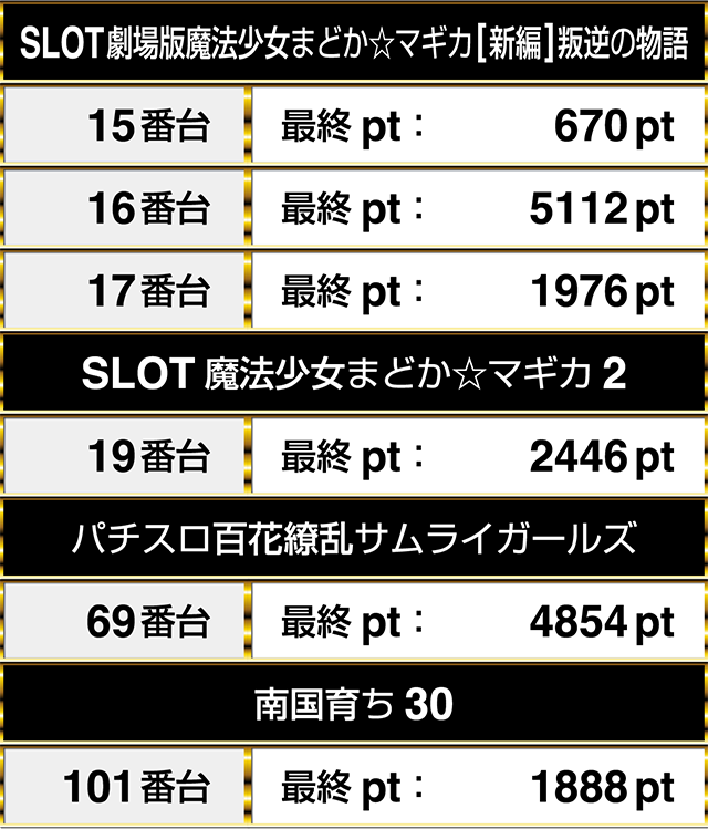 『SLOT魔法少女まどか☆マギカ2』の19番台は2446pt、『南国育ち30』の101番台は1888ptを記録!!