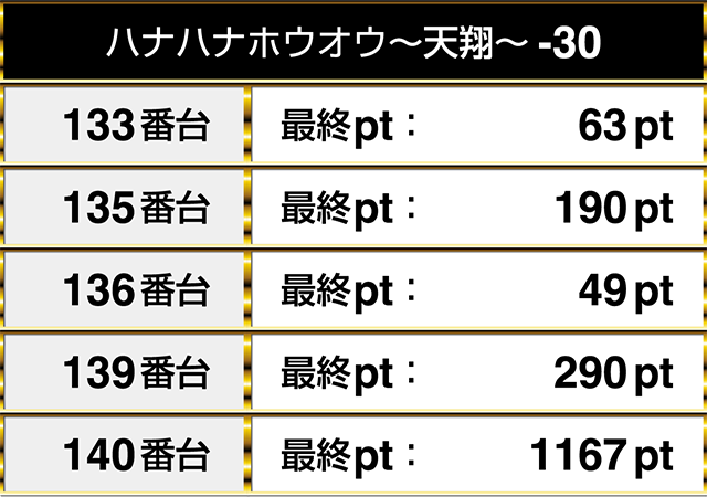 『ハナハナホウオウ~天翔~-30』の5台がプラスptを記録し、そのうちの1台は1000ptオーバー!!