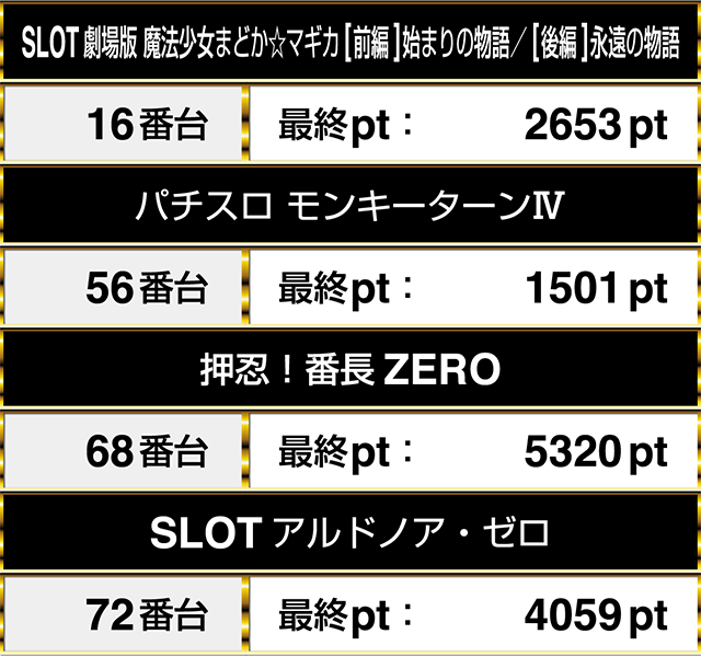 『パチスロ モンキーターンⅣ』の56番台は1000ptオーバー、『SLOT劇場版 魔法少女まどか☆マギカ[前編]始まりの物語/[後編]永遠の物語』の16番台は2000pt以上であった。