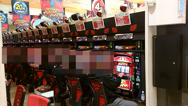 開店直後の20円パチスロでは、ハナハナシリーズや「バジリスク~甲賀忍法帖~絆」が空き台も見当たらないほどに注目を集めていた。