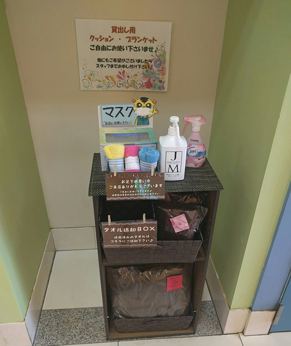 クッションやブランケットの貸し出し、雨の日用のタオルも置かれているなど、思いやりを感じられる工夫も満載。