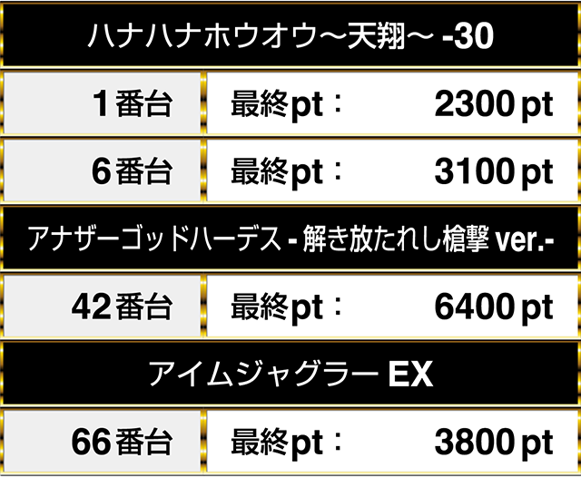 『ハナハナホウオウ~天翔~-30』の1番台が2300pt、6番台は3100ptを記録!