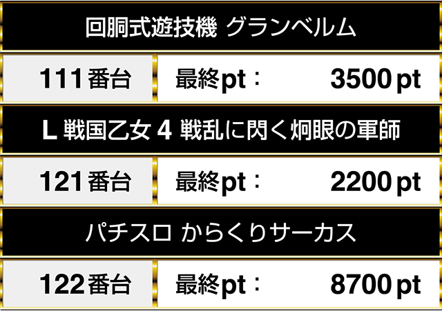 111番台の『回胴式遊技機 グランベルム』は3500ptを記録してこの日を終えた。