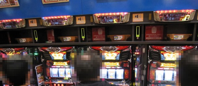 最初に向かったのが21.739スロコーナー。冒頭に掲載した写真の通りドル箱別積みが見えた沖スロのシマに足を踏み入れた。