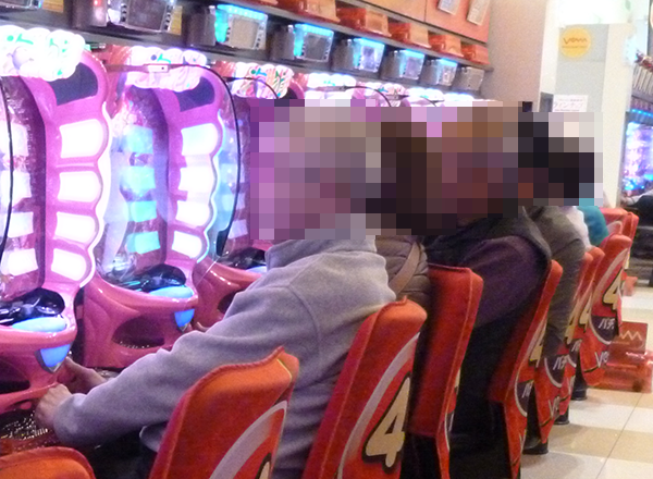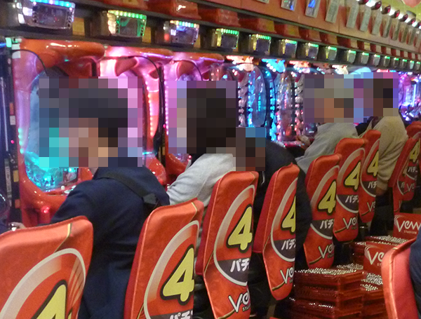 午後の4円パチンコにおいて、もっとも盛り上がっていたのは海物語シリーズ。機種のポテンシャルを引き出すといった姿がズラリと並んでいる光景は壮観であった。