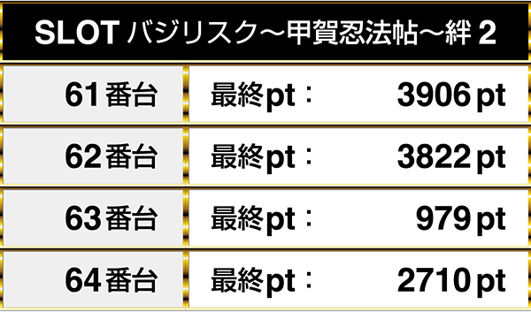 人気を集めていた『SLOTバジリスク~甲賀忍法帖~絆2』は、全台がプラスptを記録してこの日を終えていた。