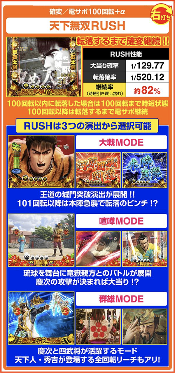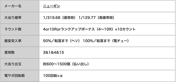 確変は転落タイプ(転落確率は約1/520)で、継続率は約82%。