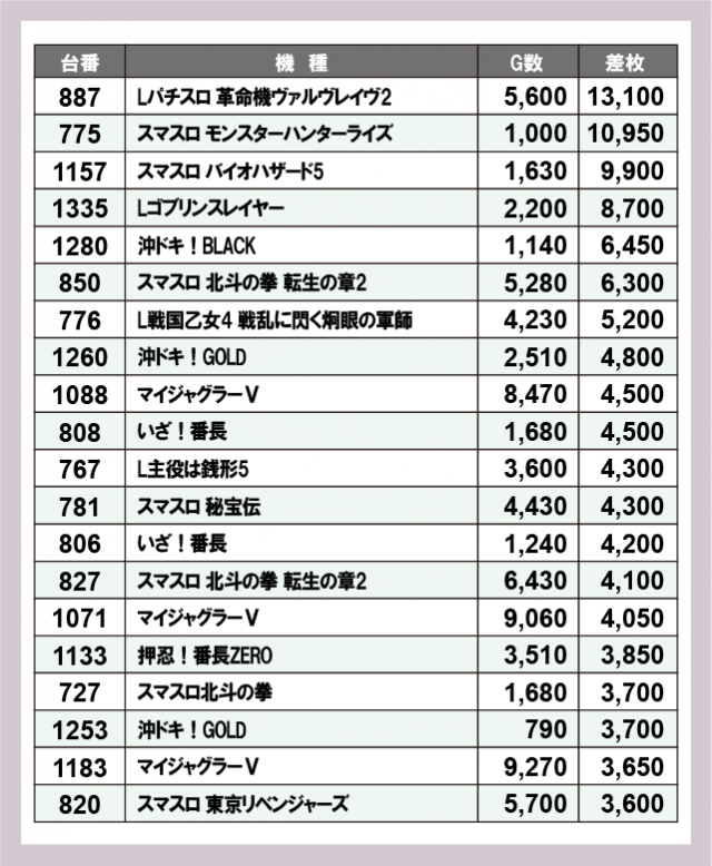 ※差枚数順に掲載しています