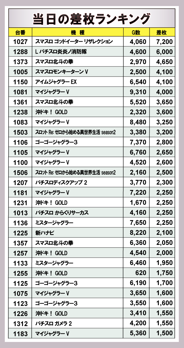『スマスロ ゴッドイーター リザレクション』から+7,000枚OVERが飛び出し、当日の店内の盛り上がりを大きくリードしていた。ほかにも『Lパチスロ炎炎ノ消防隊』が+6,000枚OVERをマークするなど、各所で打ちごたえのある状況が整っていたことが窺えるだろう。