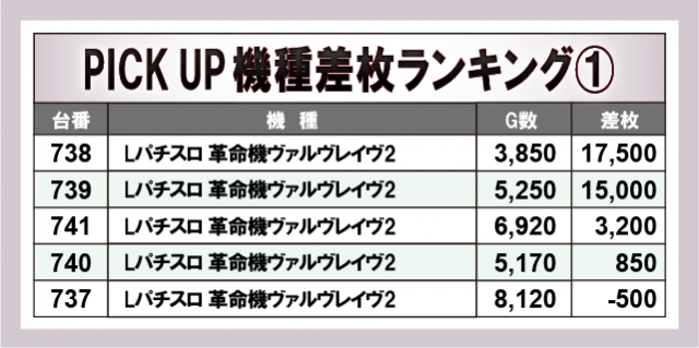 上表からスマスロ機・ノーマル機どちらも随所で動きが強く、フロア全体が活気づく一日になったことが分かる。『Lパチスロ 革命機ヴァルヴレイヴ2』では+17,500枚や+15,000枚といった大型差枚が飛び出し、圧巻のパフォーマンスを披露。さらに『パチスロ からくりサーカス』も万枚OVERを筆頭に優秀台が複数並び、高配分を思わせるデータが続出した。ノーマルタイプでは『ネオアイムジャグラーEX』や『ファンキージャグラー2』が4桁プラスの伸びを記録し、終日にわたって安定感を披露。機種ごとに見どころが散らばる、非常にメリハリの効いた構成だったと言えるだろう。
