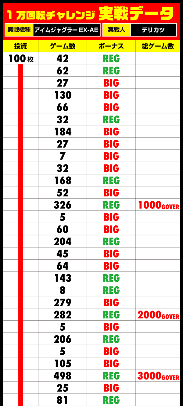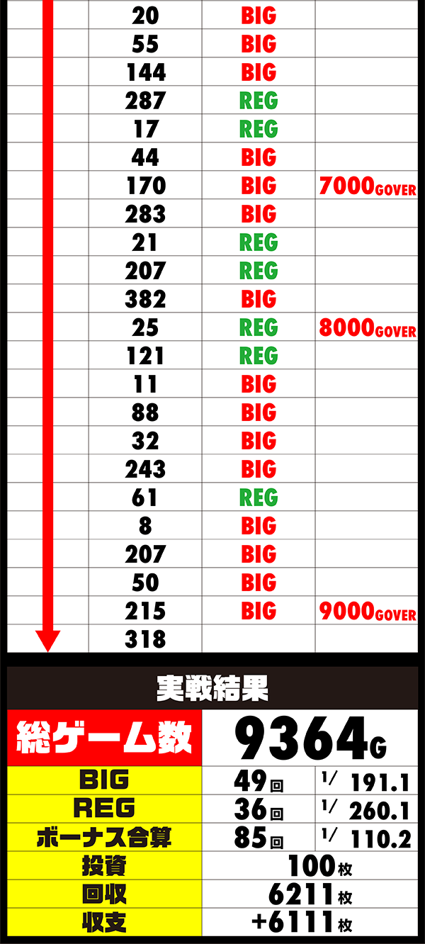 これほどまでにボーナスを引いてしまっては、さすがにゲーム数を消化しきることはできず、チャレンジ自体は600G以上を残して失敗となってしまった。