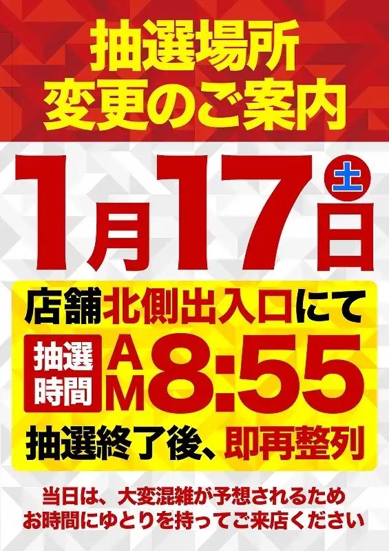 店舗にて8:55より抽選(変更がある場合は、別途ご案内いたします) |