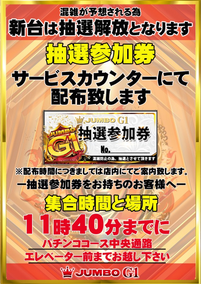 【店内休憩所にて実施】8:35~抽選参加券配布▶8:40~抽選開始▶8:50~入場再整列▶8:55入場 ※抽選時間に関してましては変更される場合がございますので、事前告知をご確認ください。 |