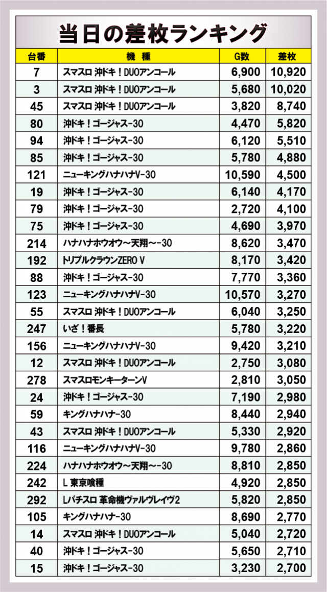 当日の差枚ランキングを振り返ると、主役を張ったのは『スマスロ 沖ドキ!DUOアンコール』。TOP3を含む複数台がランクインし、6,000G前後~7,000G弱までしっかり回された台が高差枚を記録。これに続く形で『沖ドキ!ゴージャス-30』も広く顔を出し、高稼働台が安定して差枚を積み上げていた。さらに『ニューキングハナハナV-30』や『キングハナハナ-30』といったハナハナシリーズも万回転クラスが確認でき、沖スロ全体で打ち込める環境が用意されていた。